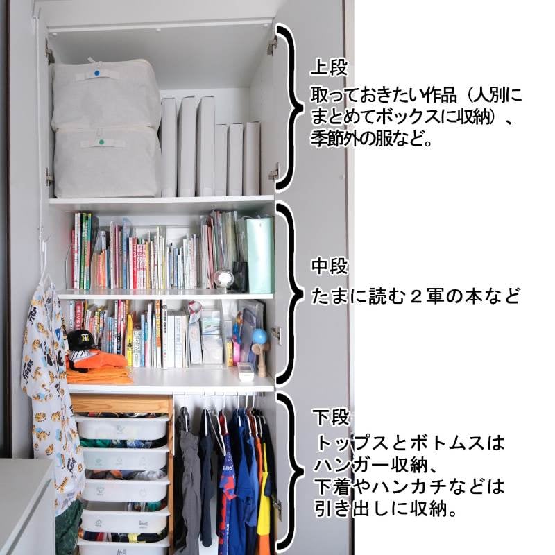 我が家では、子どもの成長に合わせて収納をどんどん変えています。3歩進んでは2歩下がるくらいの感覚であれこれ試しながら、話し合いながら、今の収納にたどり着いています。洋服は、幼児のときは引き出し収納のみ。小学生になってからハンガー収納も導入したり、本が増えたら1軍と2軍に分けて収納場所を変えたり、収納場所に貼るのはラベルプリンターで作ったシールではなく養生テープやマスキングテープのほうが使い勝手がよかったり。