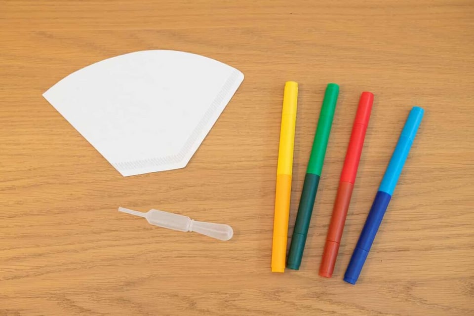 ① コーヒーフィルターに、水性ペンで点をうったり、線をかいたりします。