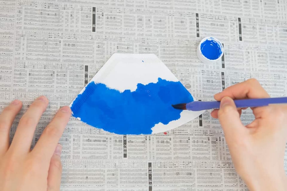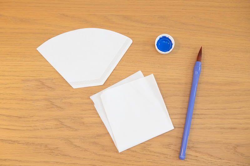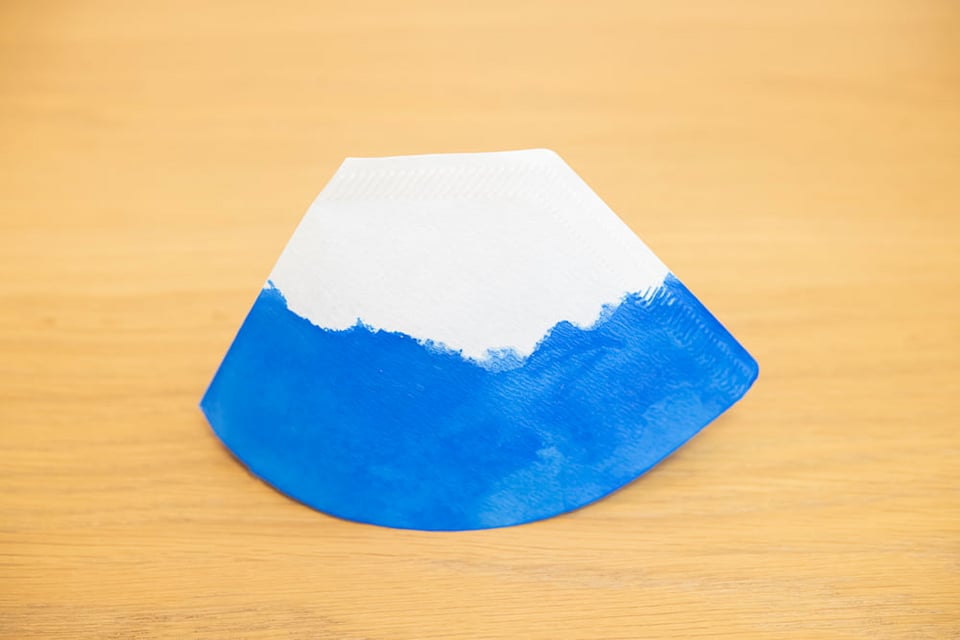 ① コーヒーフィルターの面積が大きい方を下にして、上部を少し空けて、絵の具を塗って乾かします。