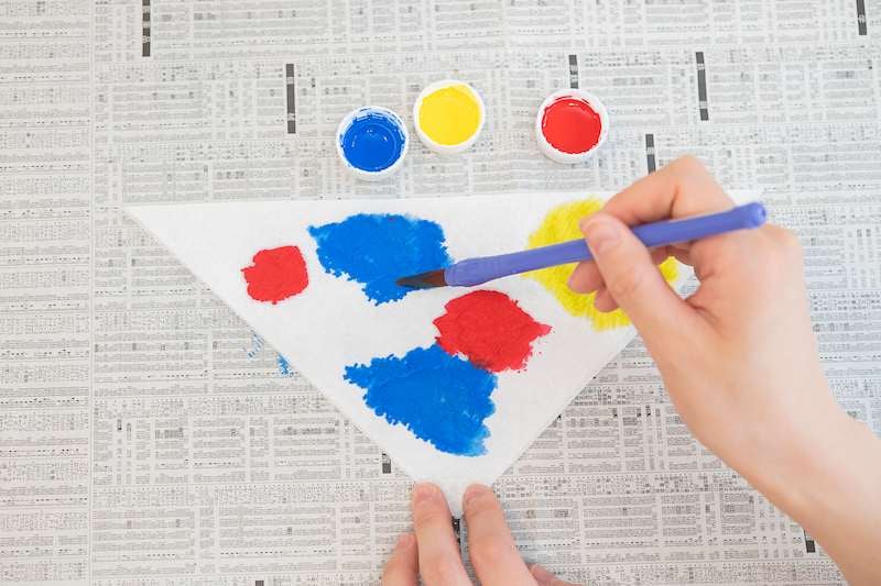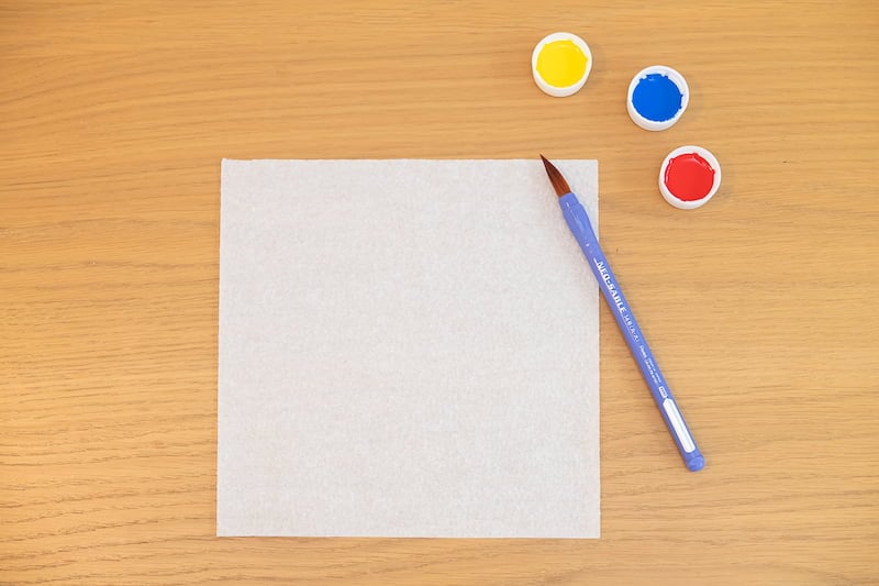 ① 2枚1組になっているキッチンペーパーをはがして、三角に一度折り、筆で絵の具をのせていきます。