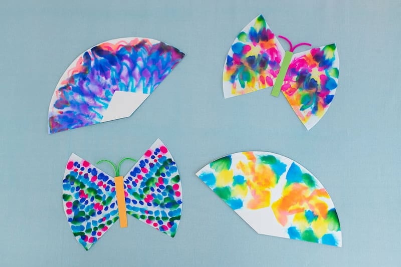・ちょう...コーヒーフィルターを半分に切り、細く切った画用紙を中心になるように貼り合わせて、モールを触角にしよう!