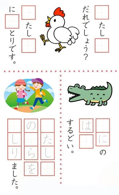 例えば、「うさぎ」「はねる」「わたし」「うたう」などの簡単な名詞や述語のカードと、「は」を書いたカードをバラバラにして、自然な文になるように組み合わせる練習をしましょう。