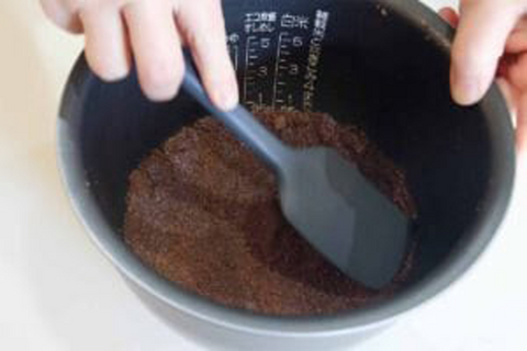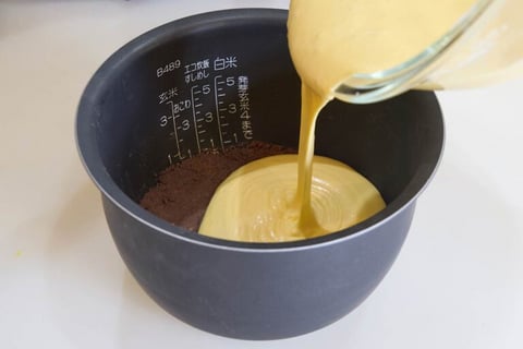 8.7の生地をココアクッキーを敷き詰めた炊飯器に流し入れる。