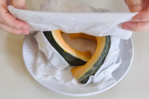3.ぬらして軽く絞ったキッチンペーパーでかぼちゃを包み、さらにラップをかけて電子レンジで加熱する(500w10分程度)。