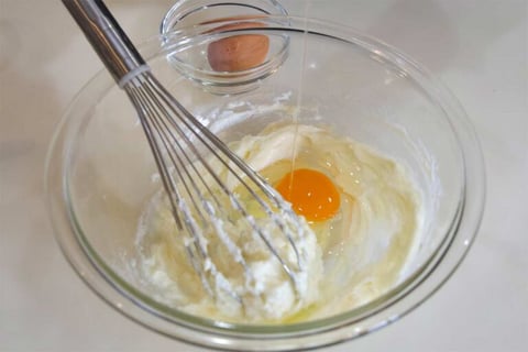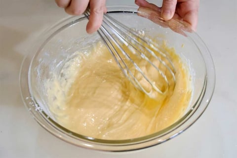 卵を1個ずつ加えてさらにホイッパーで混ぜ合わせる。