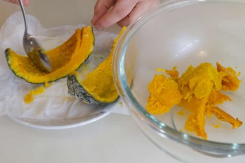 6.かぼちゃの皮を剥いて中身を取り出し、生クリームを少々加えてペースト状になるまで混ぜる。
