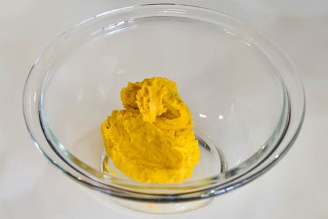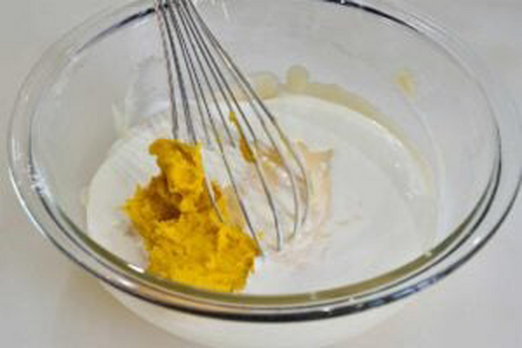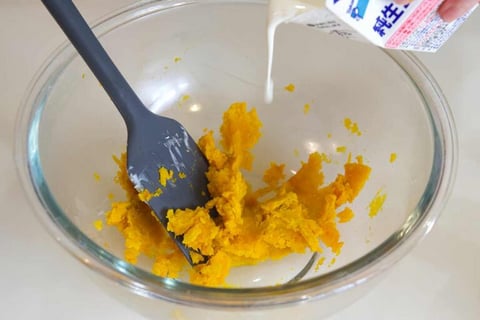 7.5の生地にかぼちゃペーストと残りの生クリームを加え、ムラなくなめらかになるまでホイッパーで混ぜる。