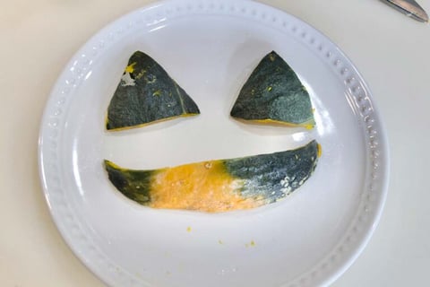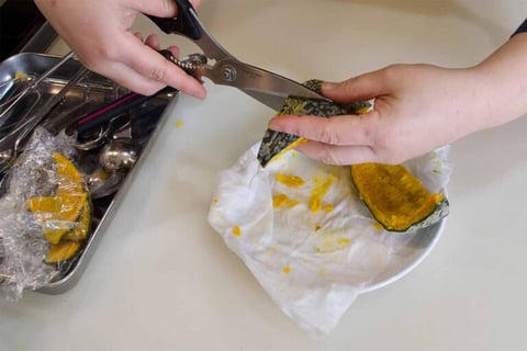 ★Point:加熱後のかぼちゃは熱くなっているので注意!デコレーションにかぼちゃの皮を使う場合は、丁寧に剥いて三角形の目や三日月型の口にカットします。