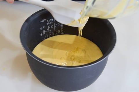ケーキモード(ない場合は普通モード)で炊飯し、その後30分間保温モードで余熱を通す。