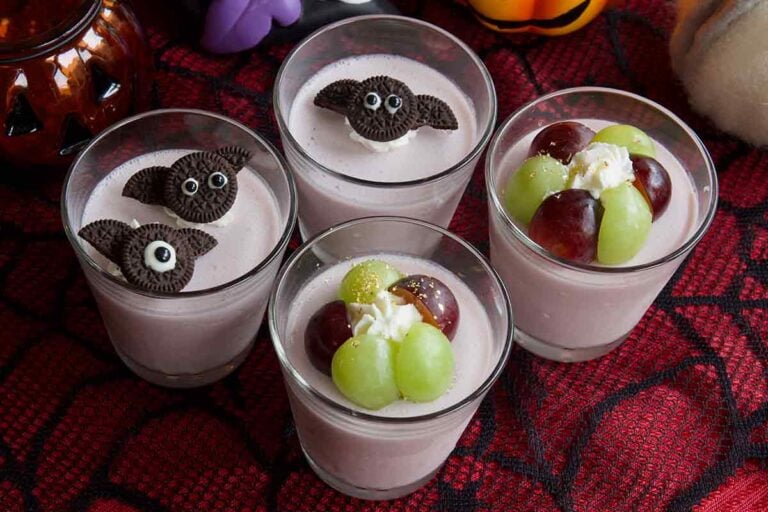 ふんわりとした口溶けとブドウの爽やかな酸味を楽しめるブドウムースに、ハロウィンらしいコウモリ型のクッキーを添えました。クッキーの代わりに巨峰やマスカットをトッピングすれば、華やかで上品な印象に。透明なカップに入れると見栄えしますが、お子さんと一緒に盛りつけを楽しむのなら、トッピングがたくさんできるパットで作るのもおすすめです。フルーツジュースは、ブドウ以外にリンゴやオレンジに変えてアレンジできます。