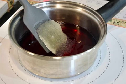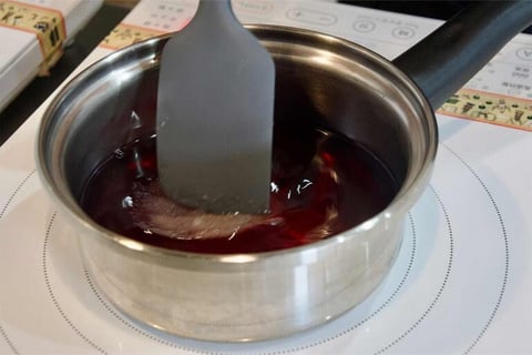 2.鍋にぶどうジュースとグラニュー糖を入れて弱火で加熱し、1を加えて溶かし混ぜる。