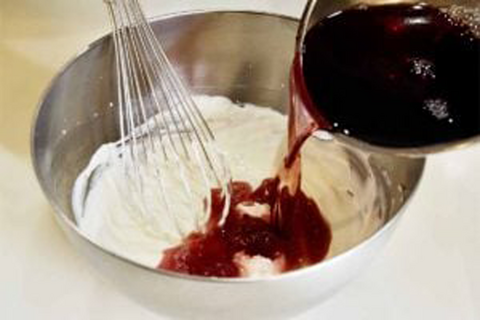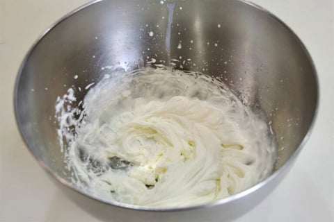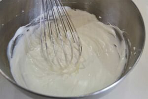 3.ボウルに生クリームを入れて泡立て、さらにヨーグルトを加えてツノが立つまで混ぜ合わせる。