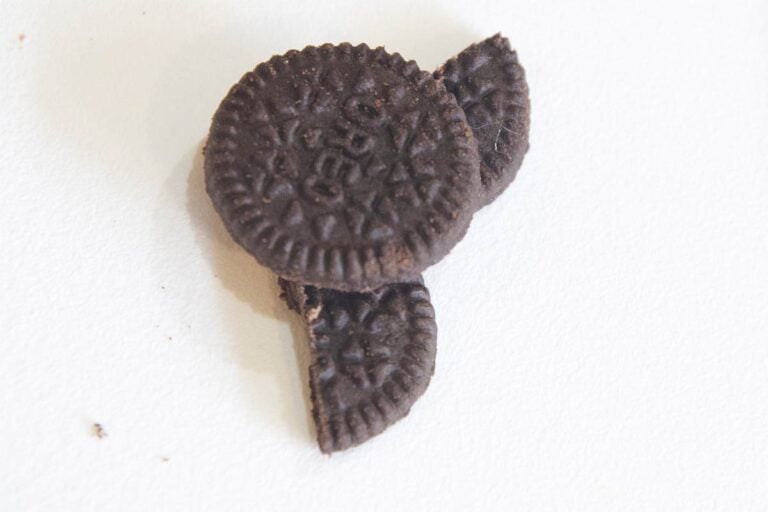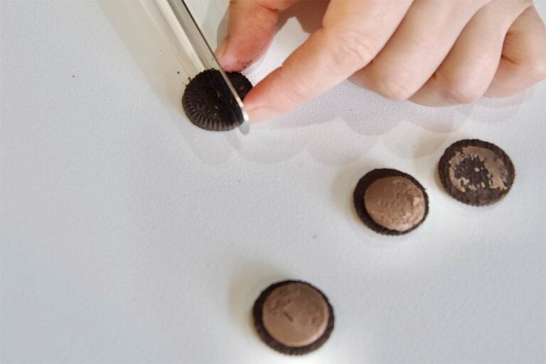 7.クッキーを2枚に分け、クリームがついている方をコウモリの顔に、ついていない方を半分に切って翼にする。