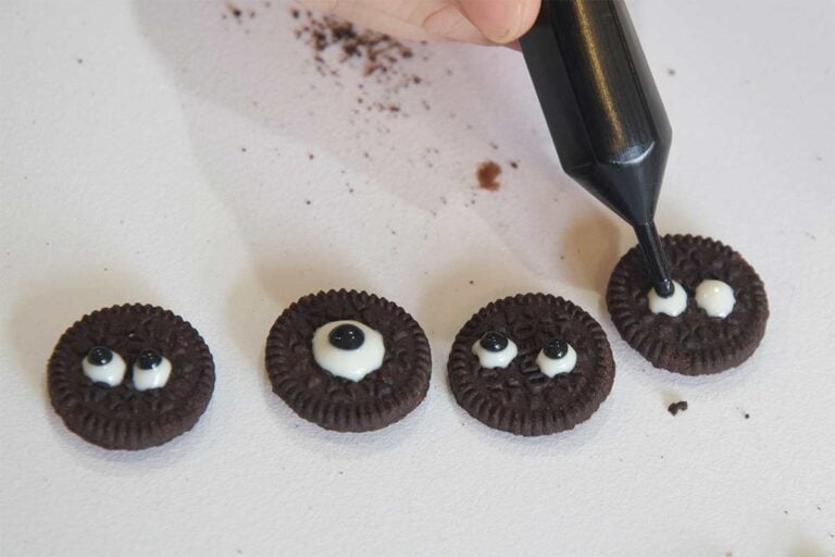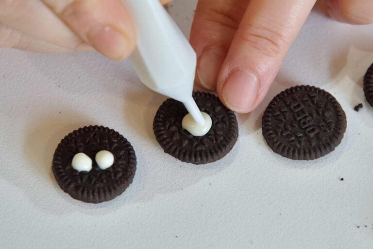 8.チョコペンが柔らかくなったり、コウモリの顔部分のクッキーに白いチョコペンで白目部分をかき、固まるのを待ってから黒いチョコペンで黒目部分をかく。