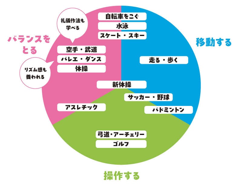 3つの動きをバランスよく発達させることで、以下の図に示されているようなさまざまな動作やスポーツができるようになります。